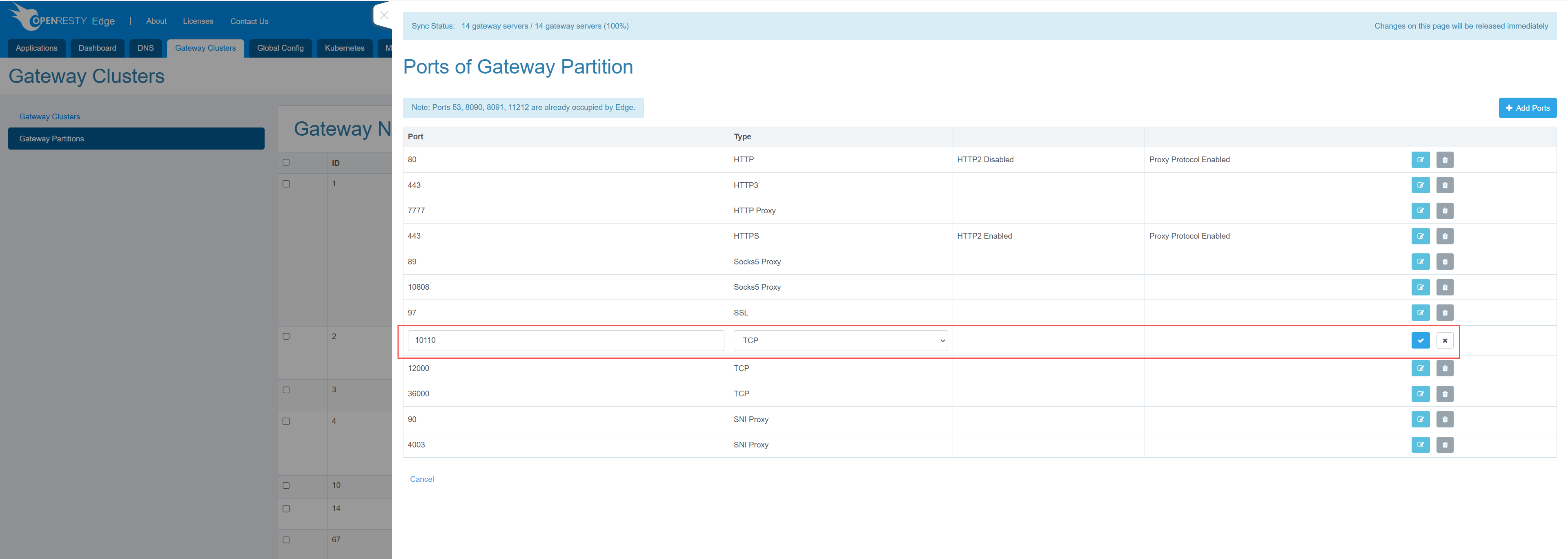 我们进入 网关集群 => 网关分区 页面,可以看到所有的分区,以及其开放的不同类型的端口。