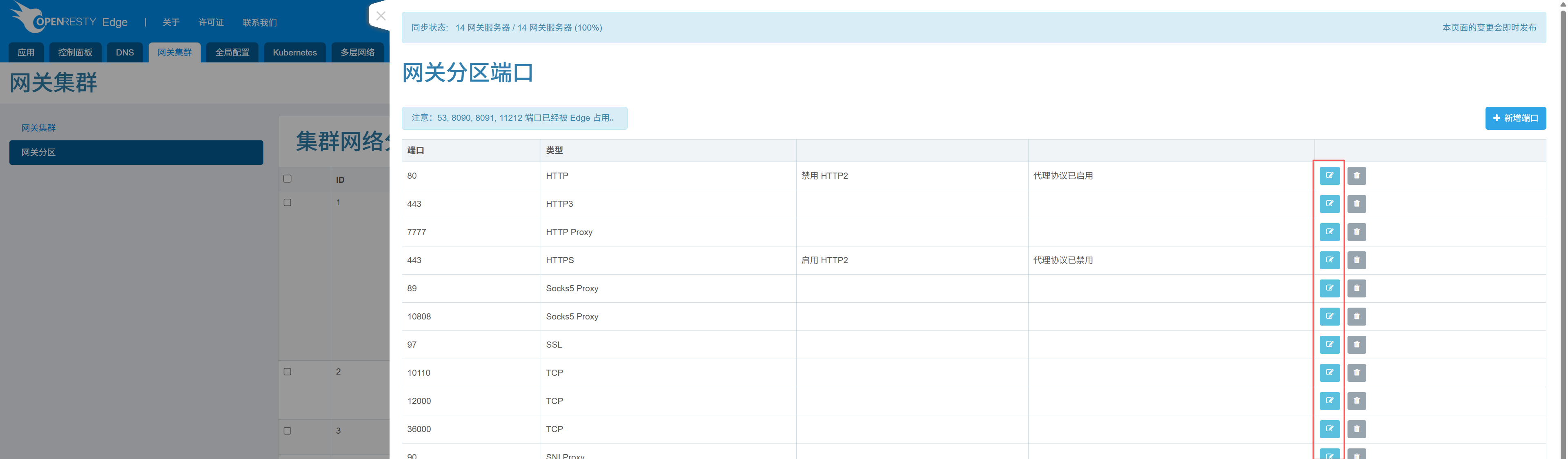 在端口列表中,选择需要启用 proxy protocol 的端口,并点击右边的编辑按钮