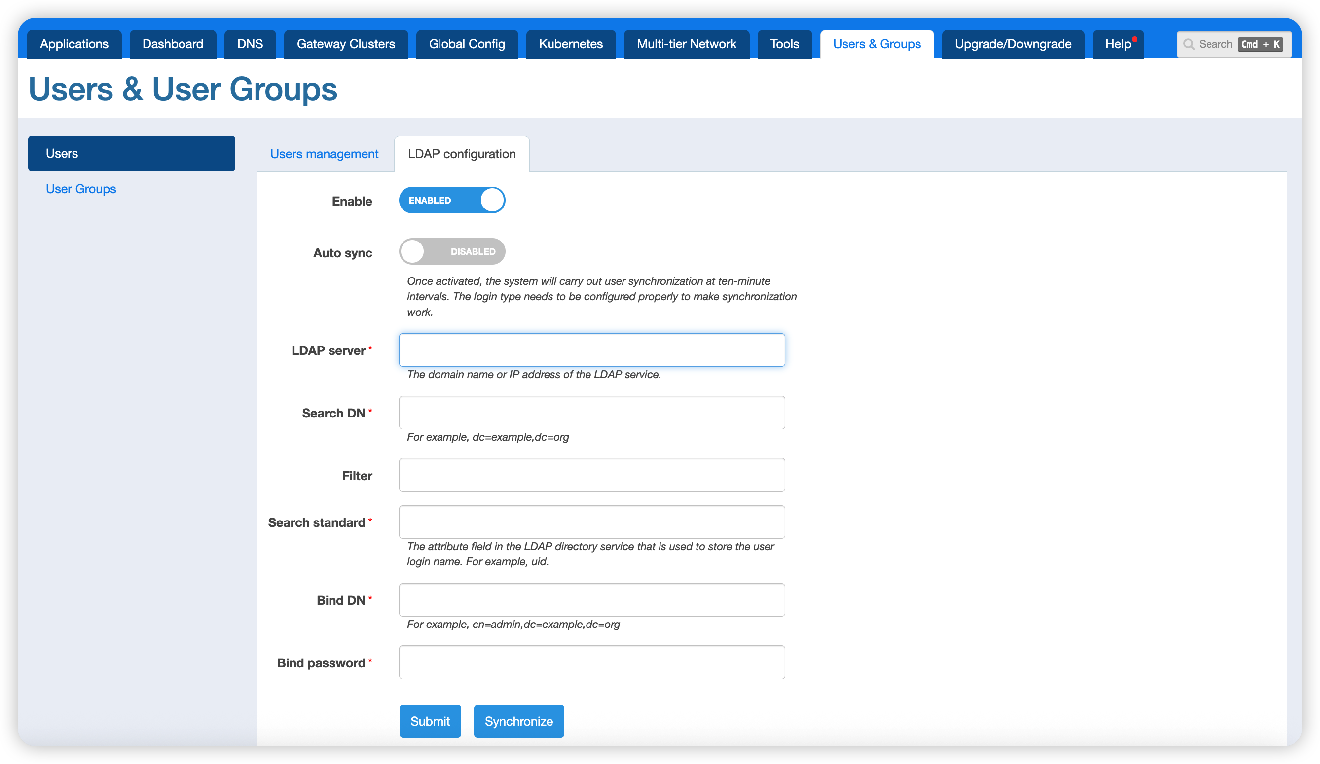 Configure the LDAP service on the Global Config > Users & User Groups > LDAP Configuration page.