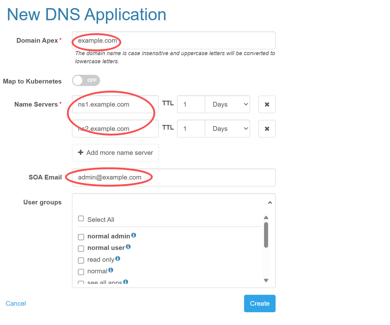 新建 DNS 應用時開啟 map to kubernetes 開關,選擇 k8s 叢集,點選建立按鈕。